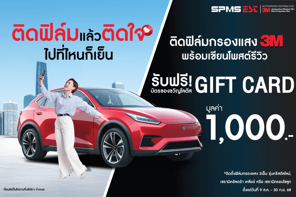 ติดฟิล์มกรองแสง3M รุ่น คริสตัลไลน์, เซรามิค อัลตร้าเคลียร์ หรือ เซรามิค แอบโซลูท ซีรีย์ ตั้งแต่วันที่ 9 สิงหาคม – 30 กันยายน 68 รับฟรี!บัตรของขวัญ มูลค่า 1,000 บาท เพียงโพสต์รูปภาพหรือวิดิโอ พร้อมเขียนรีวิว “ติดฟิล์มแล้วติดใจ ไปที่ไหนก็เย็น” กติกา : รายการส่งเสริมการขายนี้ ไม่สามารถใช้ร่วมกับรายการส่งเสริมการขายอื่นๆได้และไม่สามารถโอนสิทธิ์ให้ผู้อื่น หรือแลกเปลี่ยนเป็นรางวัลอื่นหรือทอนเป็นเงินสดได้ หมายเหตุ : บริษัทฯจะจัดส่งของสมนาคุณหลังจากตรวจสอบหลักฐานการโพสต์รีวิว บัตรรับประกันฟิล์ม มีการติดตั้งจริง และหลังจาดสิ้นสุดระยะเวลากิจกรรมภายใน 15 วันทำการ