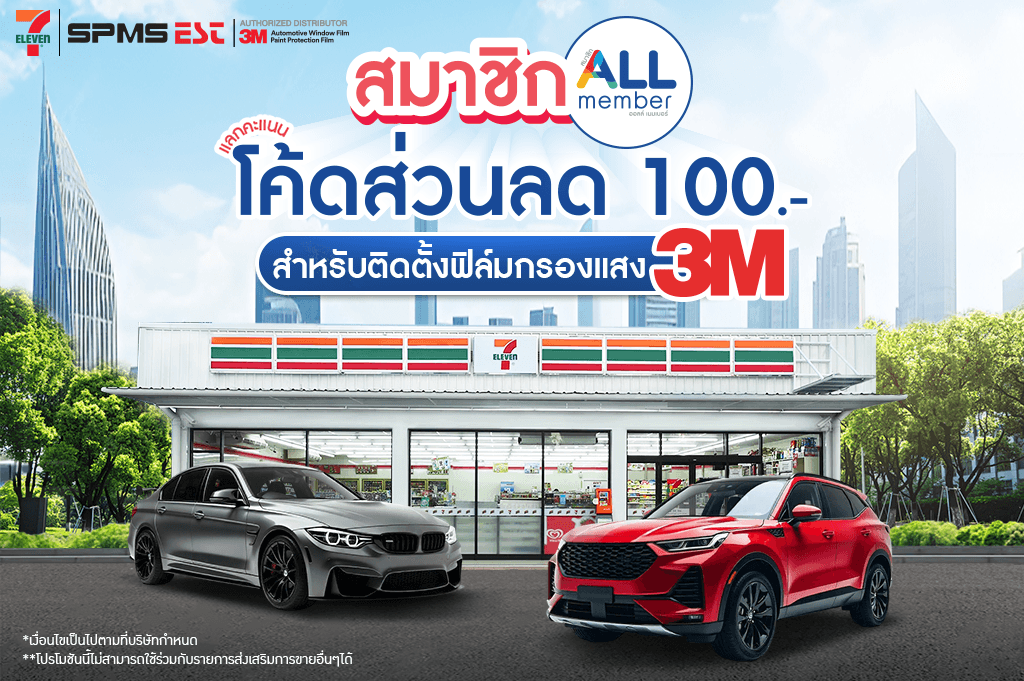 สมาชิก ALL Member แลก 7 คะแนน รับโค้ดส่วนลด 100 บาท เมื่อติดตั้งฟิล์ม 3M CRYSTALLINE, 3M CERAMIC ULTRA CLEAR หรือ 3M CERAMIC ABSOLUTE รอบคัน+บานหน้า กดรับสิทธิ์ได้ตั้งแต่ 24 กันยายน 2568 ถึง 31 ธันวาคม 2568 หรือจนกว่าสิทธิ์จะหมด วิธีรับสิทธิ์ กดรับสิทธิ์ผ่าน 7-Eleven TH Application และแสดงรหัส (Code) ที่ได้รับแก่ร้านตัวแทนติดตั้งฟิล์มกรองแสงรถยนต์ 3M ที่ร่วมรายการ ก่อนชำระค่าบริการ *กรุณาแสดงรหัสเพื่อใช้สิทธิ์ภายในวันที่กำหนด เงื่อนไข 1. สมาชิก ALL Member แลก 7 คะแนน รับโค้ดส่วนลด 100 บาท เมื่อติดตั้งฟิล์ม 3M […]