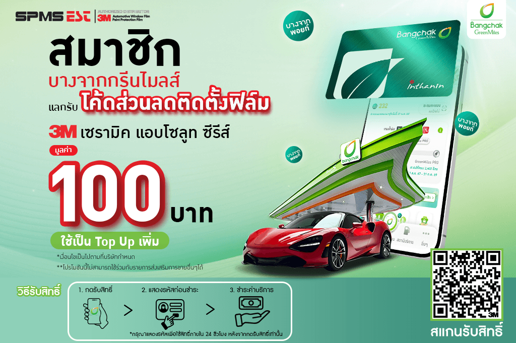 สมาชิกบางจากกรีนไมลส์ แลกรับโค้ดส่วนลด 100 บาท เมื่อติดตั้งฟิล์มติดรถยนต์ 3M รุ่นยอดนิยม
