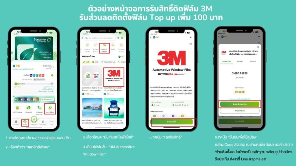 กดรับสิทธิ์ผ่าน Bangchak Mobile Application หรือเว็บไซต์ www.bcpgreenmiles.com และแสดงรหัส (Code) ที่ได้รับแก่ร้านตัวแทนติดตั้งฟิล์มกรองแสงรถยนต์ 3M ที่ร่วมรายการ ก่อนชำระค่าบริการ