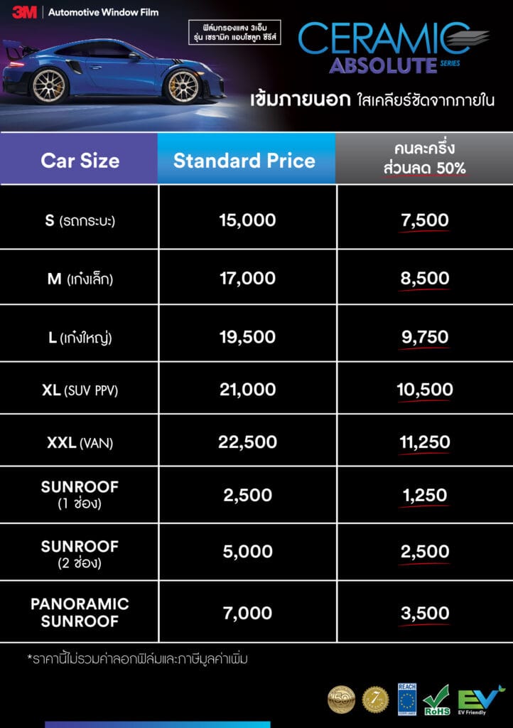 - รถคันที่ 1 ติดตั้งฟิล์ม 3M รุ่น Ceramic Absolute Series ในราคาส่วนลด 50% จากราคามาตรฐาน